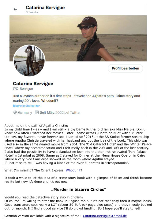 Auf den Spuren von Agatha Christie Seit meiner Kindheit bin ich gnadenloser Fan von Dame Margaret Rutherford alias Miss Marple. Ich liebe ihre schwarz/weiß Filme noch heute. Später kam das Interesse an den 20er Jahren, der Weimarer Republik hinzu. 2015 reiste ich auf der SS Sudan den Nil entlang, dem Schiff, auf dem Agatha Christie die Idee zum Buch „Tod auf dem Nil“ hatte und das 2004 im gleichnamigen Film zu sehen ist. Mein Favorit ist und bleibt aber „Tod auf dem Nil“ mit Sir Peter Ustinov. Ich übernachtete im ‚Winter Palace Hotel‘ in Luxor und dem ‚Old Cataract Hotel‘ in Assuan, in Istanbul durfte ich 2008 einen Blick in das damals noch nicht renovierte ‚Pera Palace Hotel‘ werfen – es war wie eine Zeitreise. Später kamen noch ein Dinner in Kairo im ‚Mena House Oberoi‘, wo mir von einem netten Concierge das Zimmer von Agatha Christie gezeigt wurde und ein Mittagessen am Euphrat in ‚Mesopotamien‘ hinzu. Was mir noch fehlt? Der Orient-Express! Die Idee, dass ich einen Krimi schreiben wollte, der eine kleine Portion Fetisch als Würze hat, hatte ich schon sehr viele Jahre – und manchmal dauert es etwas, damit am Ende endlich alles gut wird. Und nein, ich vergleiche mich nicht mit Agatha Christie, das wäre vermessen! Und nun ist der da, mein erster Kriminalroman und vielleicht bleibt er nicht allein: Wer ein handsigniertes Buch mit einer persönlichen Widmung haben möchte, kontaktiert mich bitte via Email: Whodunit? ;-) Buch kaufen: https://www.bod.de/buchshop/mord-in-bizarren-kreisen-catarina-bervigue-9783755709954 Leseprobe/Click for preview: Buchbesprechung Charon-Verlag "Schlagzeilen" _________________________________________________________